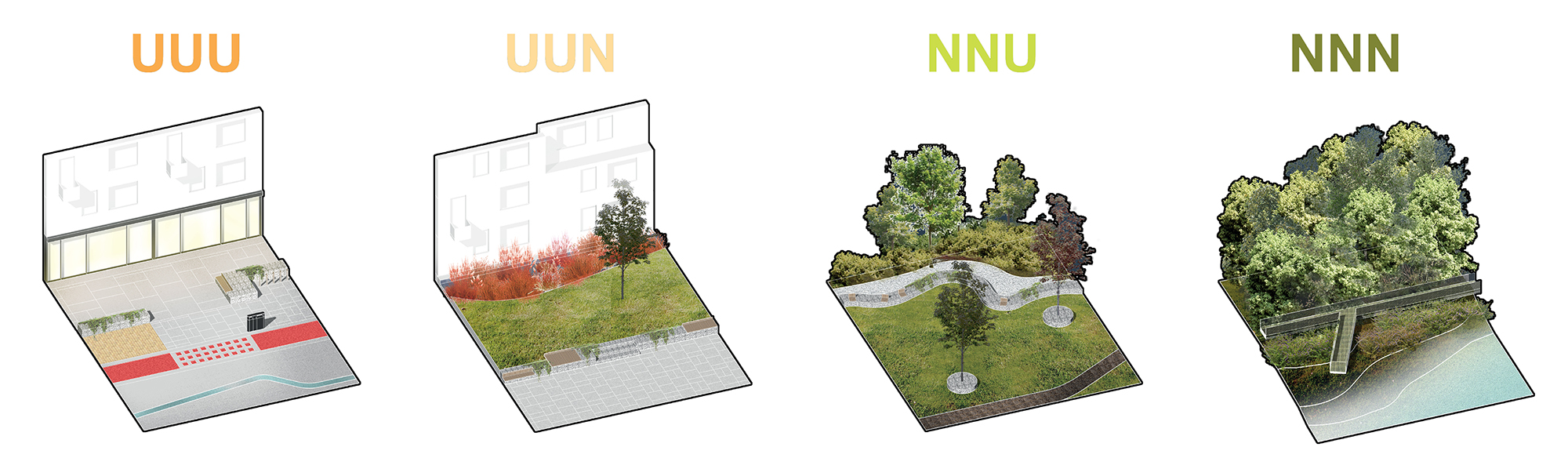 В каждой зоне на уровне дизайна поддерживается свой баланс приоритета природных экосистем / общественных функций.