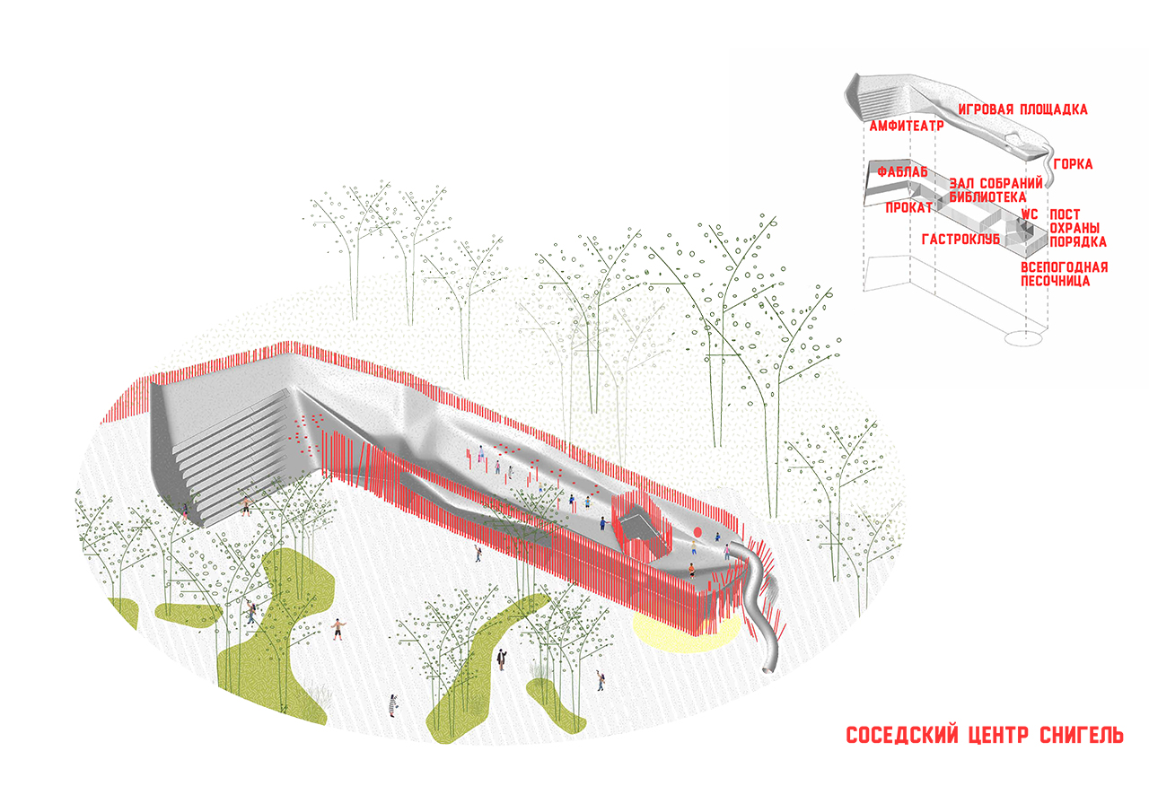 Эти два опорных фактора непосредственно выражаются в организации на территории в границах проектирования двух базовых объектов - соседского центра Снигель и водного комплекса Аалто. Оба объекта устроены мультифункционально, реализуя одновременно несколько сценариев использования различными социальными группами. Также функционал обоих объектов может варьироваться и масштабироваться за счет использования множества прилегающих открытых общественных пространств.
