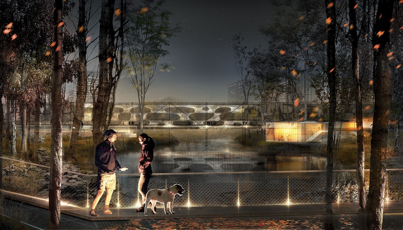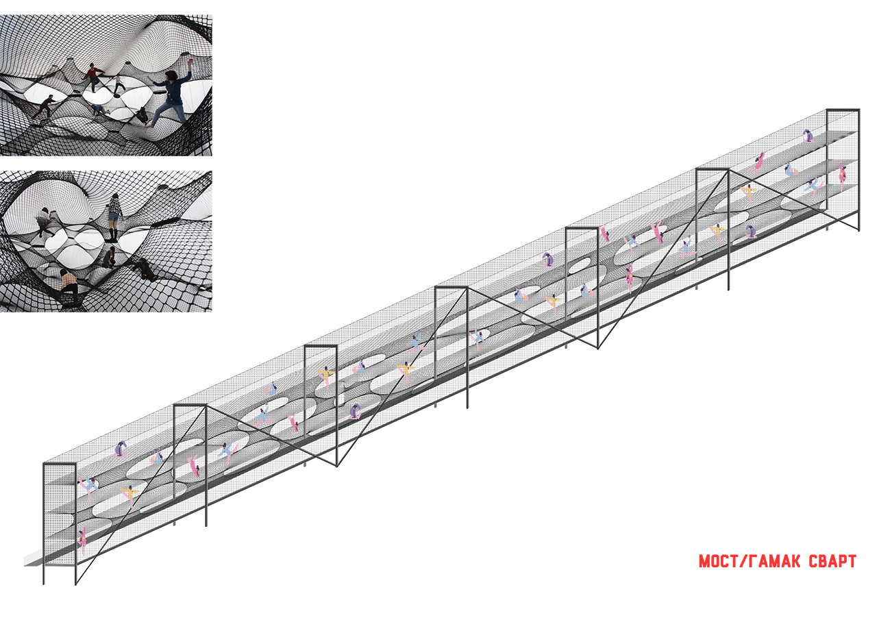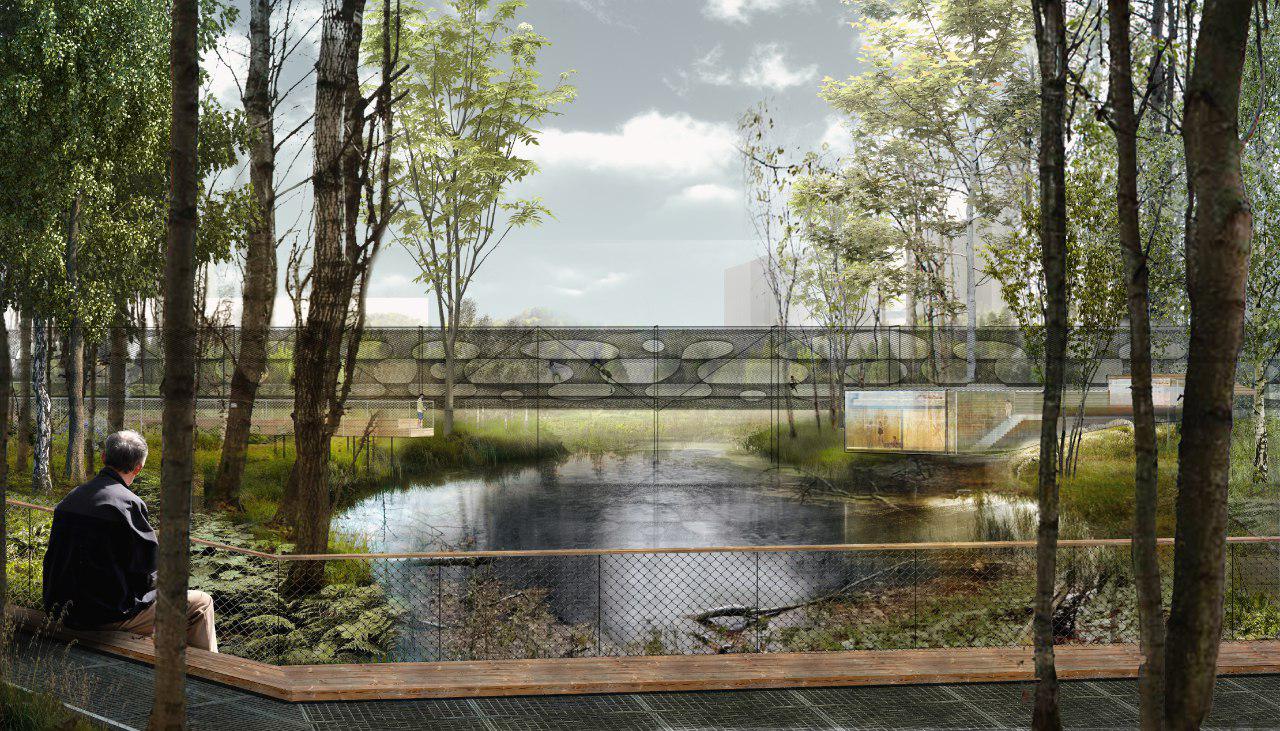 Мост решает сразу несколько задач. Он необходим для сквозного дугового прохода через парк, соединяющего Липовую поляну, водный комплекс Аалто, Березовую поляну и бульвар а также для социального контроля, визуального мониторинга, любования и наблюдения за состоянием пруда, прибрежных и береговых экокомплексов и зоны NNN.