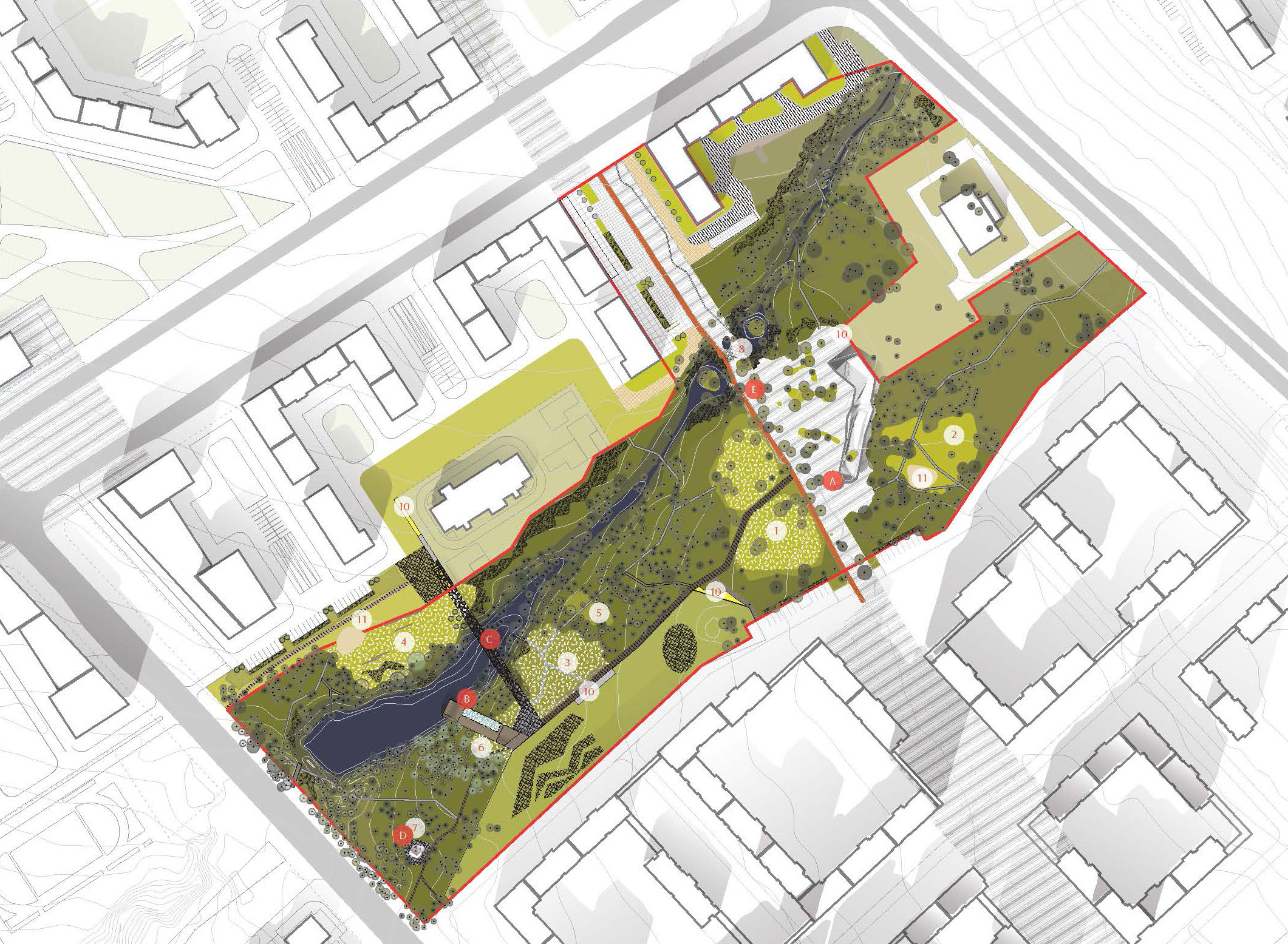 Открытые водотоки и фрагменты растительности образуют в масштабе округа связанный экокаркас, который экокаркас необходимо поддержать на уровне зонирования открытых городских пространств.