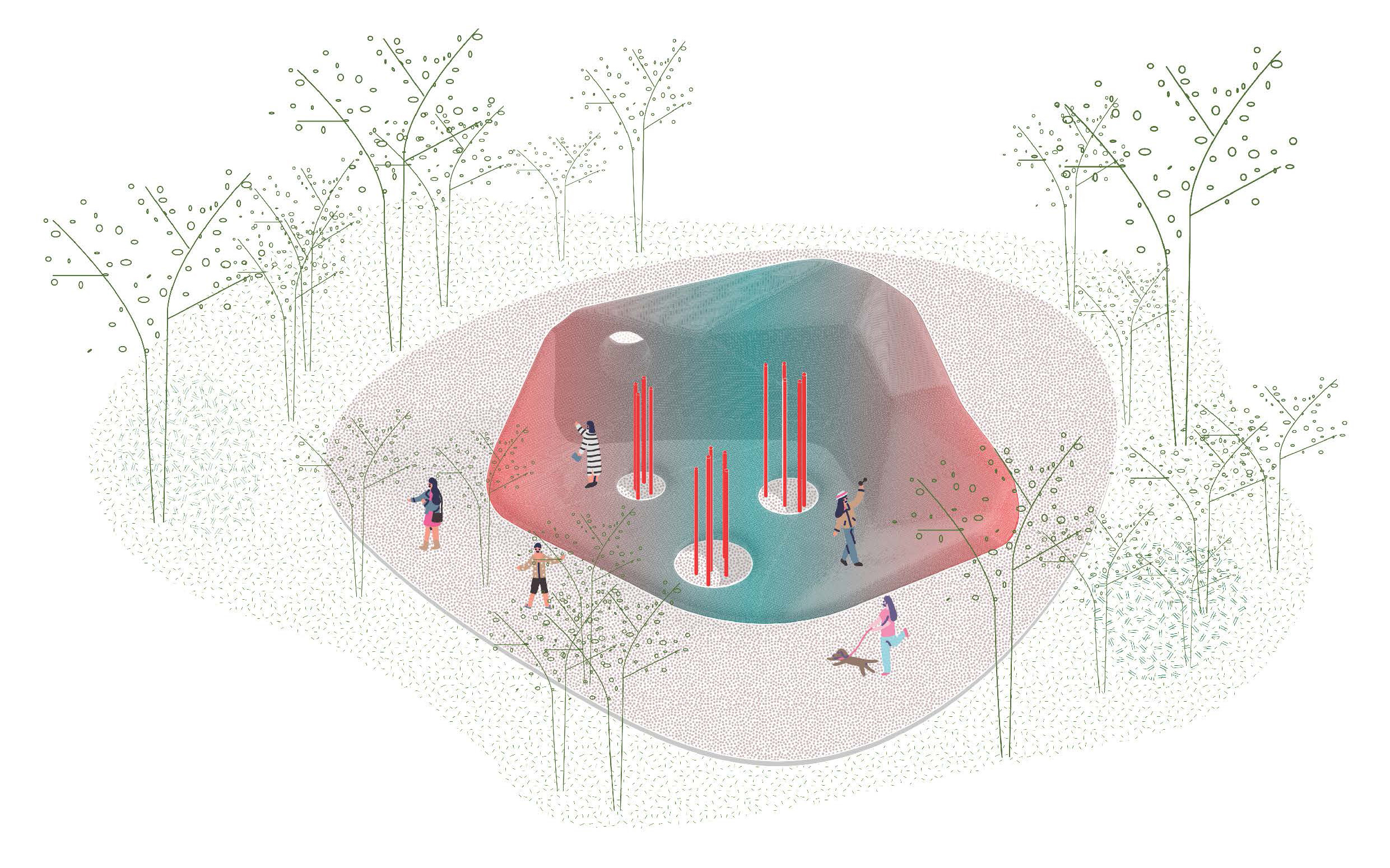 Сад троллей - объект неоднозначной протоорганической формы размером с поляну, покрытый светло-серым полиуретаном, пространство вокруг него и отверсия для деревьев покрыты мульчей карминового цвета.